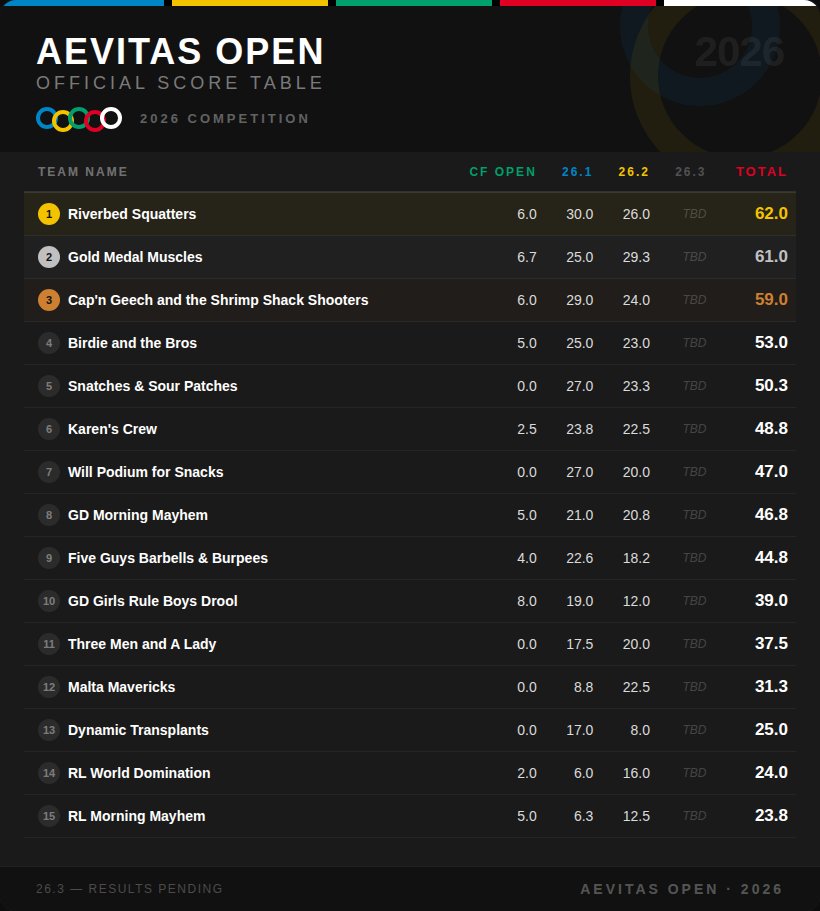 Below are the tallied scores after 26.1 and 26.2. We also added in the *correct score tabulation for the CrossFit Open registrants, which adds to your team score!